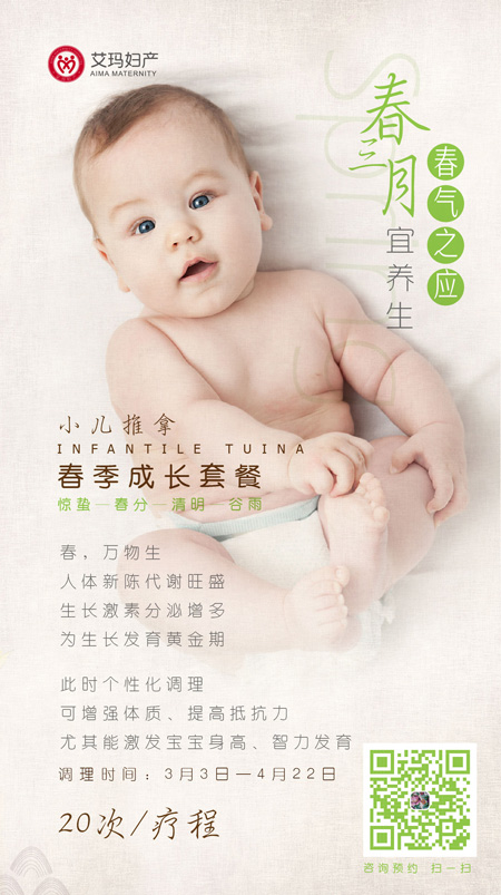 “中医讲究顺势施治,遵循大自然和人体生理变化节律进行相应养生。从惊蛰开始,至春分、清明、谷雨(3月3日—4月22日),这段时期是孩子成长发育最理想的黄金时间,此时进行个性化调理,不仅可增强体质、提高抵抗力,尤其能激发宝宝身高和智力发育。”艾玛儿科小儿推拿高级技师魏娜娜老师介绍说,“所以,我们特别在这个时段推出宝宝‘春季成长套餐’,运用推拿的方式,通过各种手法刺激穴位,使宝宝经络通畅、气血流通、修正脾胃、补养正气、激发多项生长因子,促进其快速、健康地发育成长。”