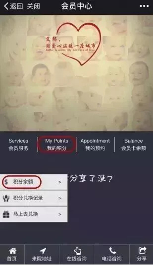 4、进入个人中心以后,首先点击“我的积分”,然后点击“积分余额”,就能看到自己的积分总数啦。根据积分总数来院就可兑换相应的礼品和医疗美容项目哦。