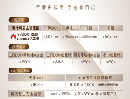 电脑辐射、加班熬夜、作息不规律等习惯引起的肤色暗黄、细纹丛生、痘痘痘印等肌肤问题,我们为你定制的美肤方案是:如果你肌肤弹性尚好,通过一项光疗美肤就可全部搞定;如果你的肌肤已有松弛下垂趋向,那么注射水光针,不仅可去除皱纹,还能刺激自身胶原蛋白增生,使肌肤重新恢复弹性!