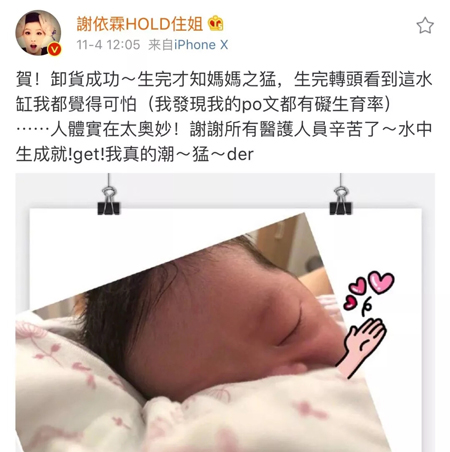 继大晒妊娠纹后,近日Hold住姐谢依霖再发微博,祝贺自己卸货成功,并自爆是在水里生的宝宝。