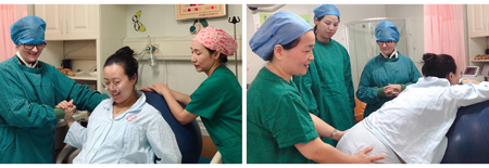 第一产程时,我们鼓励孕妇时而下床到处走走,时而扶着椅子蹲在地上,时而坐在瑜伽球上……