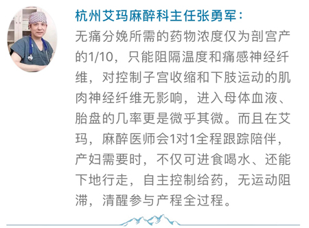 杭州艾玛妇产医院开展的无痛分娩,更是实行了“麻醉医师24小时随叫随到制度”,即使在半夜,若是产妇有需求,也可得到无痛分娩服务。