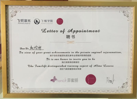 在本次认证会上,我院妇科大主任赵玲利被特聘为飞顿菲蜜丽培训专家,加入其大中华区特聘专家组。这不仅是对赵主任在该领域的认可,更预示产后女性将在艾玛得到更规范、安全及有效的私密修复。