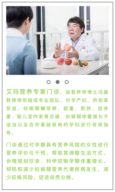“从整个孕期乃至产后,我们都会提供关于营养的指导与宣教服务。好妈妈俱乐部的课程,对孕期营养知识进行宣教;营养门诊的个性化指导与干预,帮助妈妈们调整生活方式、合理规划饮食、科学控制孕期体重增长;产后营养指导,促进产后妈妈们的修复与母乳喂养。”