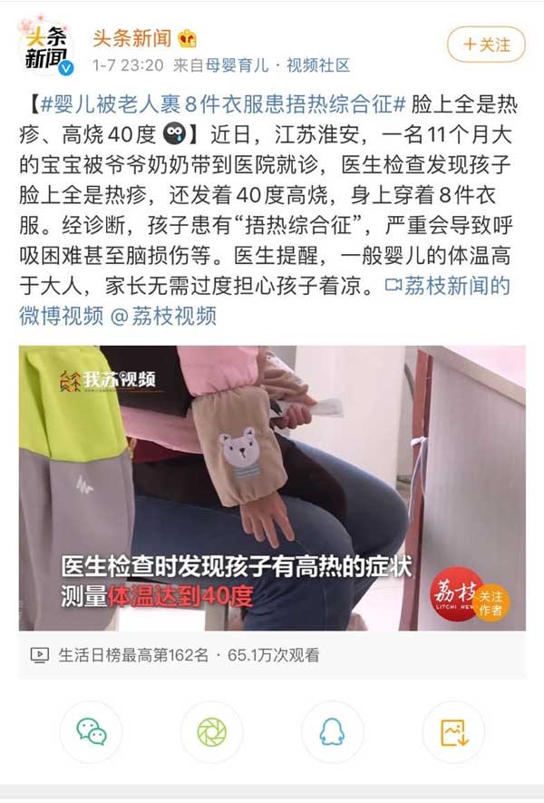 近日,江苏淮安,一名 11 个月大的宝宝被爷爷奶奶带到医院就诊。医生检查时发现:宝宝脸上全是热疹、高烧 40 度,与此同时,身上竟然还穿着 8 件衣服!