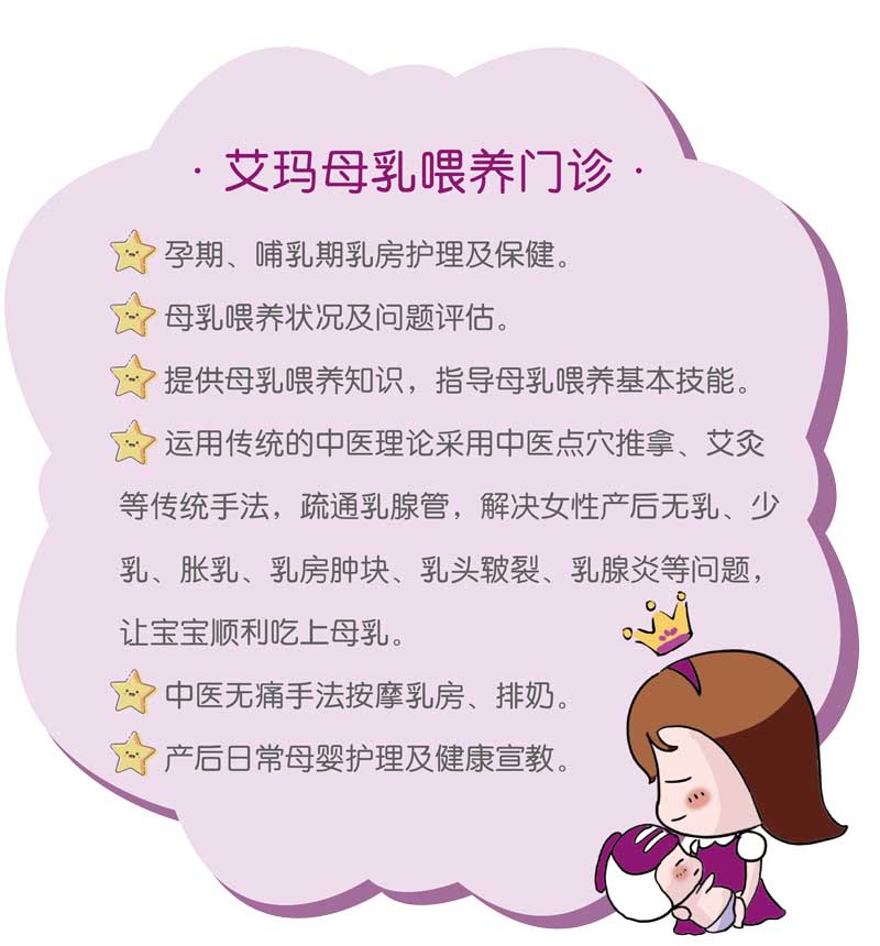 “当宝妈们在哺乳时感觉到不适,或觉得乳汁排出不顺畅时,就该考虑寻求专业帮助,及早发现问题,并及时调整。”艾玛母乳喂养门诊专家求幼岚说,“因此,我们特别开设母乳喂养门诊,就是希望能为这些妈妈提供专业指导,帮助她们解决喂养过程中出现的问题,成功母乳喂养。”
