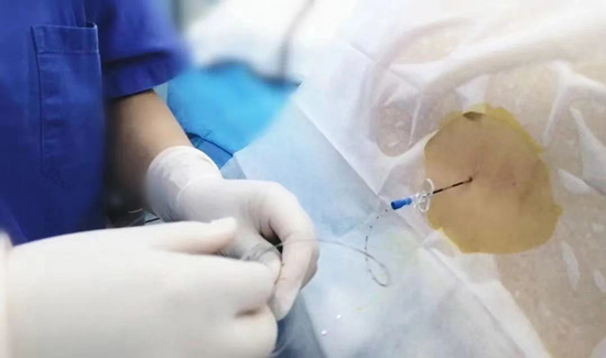 然后,连接上硬膜外导管(软的),移出针头,固定导管,连接镇痛泵,就可以享受无痛的舒适了!