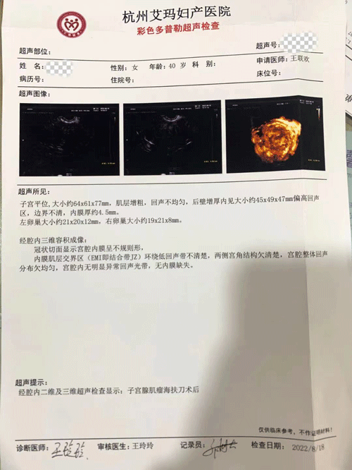 8月,Y女士来院复查,超声显示,子宫大小64*61*77mm,后壁45*49*47mm,较未治疗前缩小了很多。