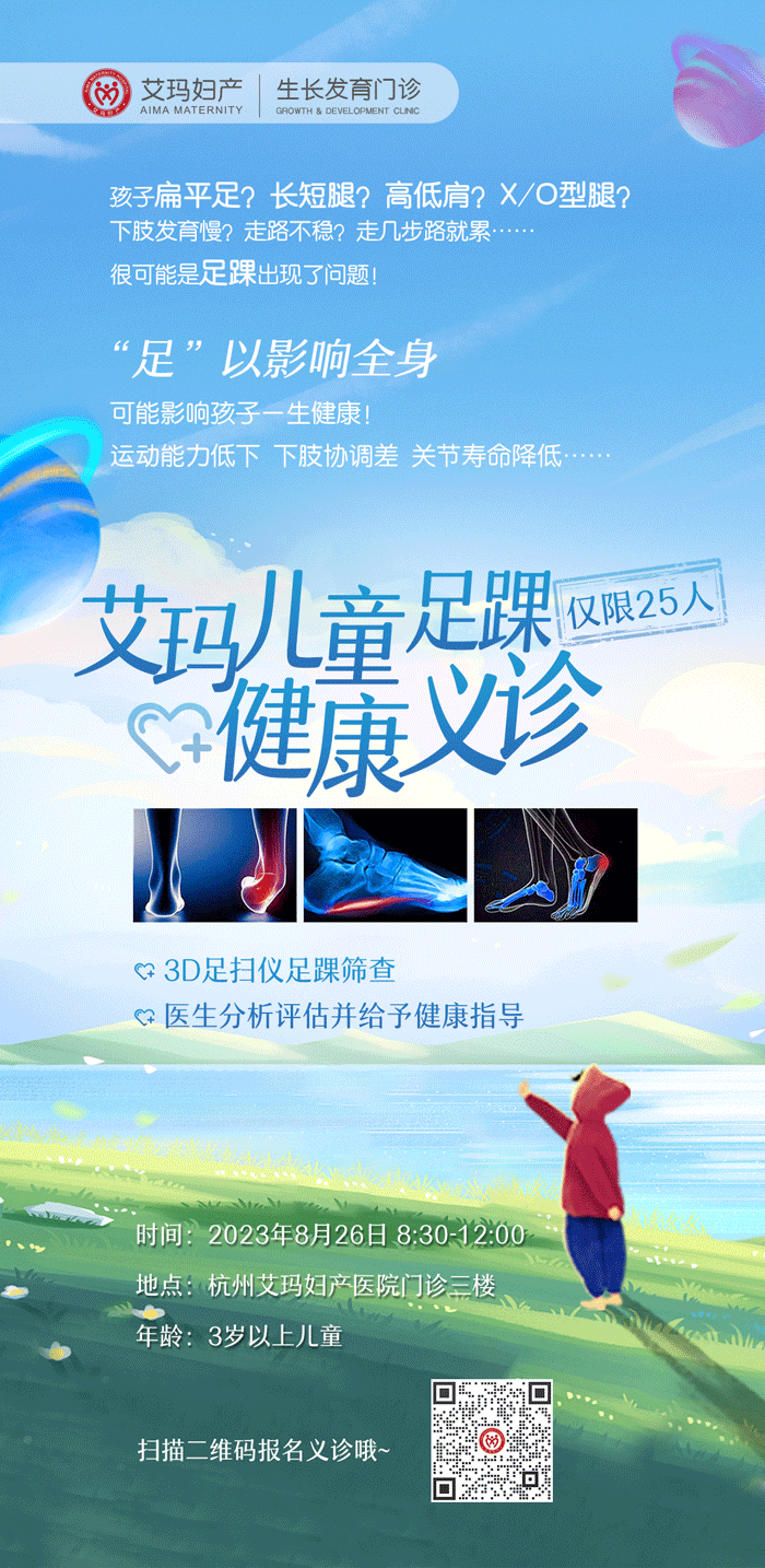 为了帮助更多孩子拥有健康的足踝与良好体态,为家长普及儿童足踝健康相关知识,艾玛将在8月26日(周六)上午举行足踝筛查义诊!免费为孩子们进行足踝功能筛查与评估。