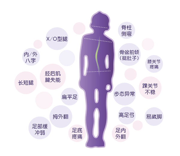 倘若早期未得到良好发展,导致足部不稳定或力线异常,将引起膝部、骨盆、躯干、肩带甚至头颈的代偿和变形!