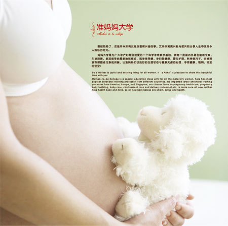 Mother-to-be College is a special education class for all the maternity women. This class has the most popular antenatal training professor from different countries. We imported the latest antenatal training processes from America, Europe, and Singapore. Our classes focus on pregnancy healthcare, pregnancy body building, baby care, confinement care and delivery rehearsal. This insures that all new mothers will be prepared in health, body and mind resulting in smart, active and health babies.